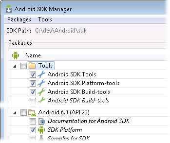 In the SDK Manager window, install the Platform tools, Build tools, and SDK Platform for the version(s) you are interested in: