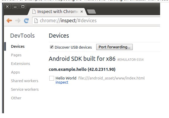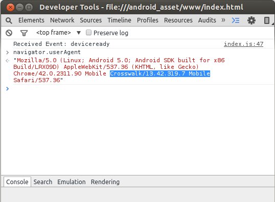 By clicking the “inspect” link under Hello World, a Chrome DevTools window will be opened. In the JavaScript console tab, you can make sure the app is running on Crosswalk by inspecting navigator.userAgent. For example, the app is running on Crosswalk 13 (Chromium M42):