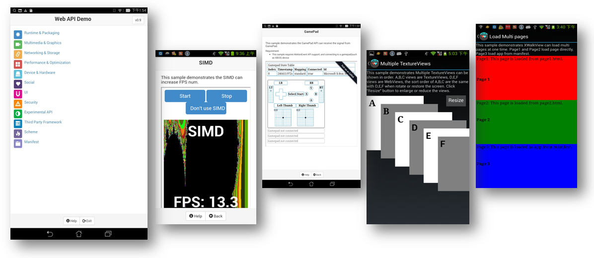 DemoExpress is a set of samples that show the Crosswalk Project advantage by having comprehensive API support: W3C standard APIs, embedded APIs, Cordova APIs and web runtime features. It includes popular web samples for Android and Linux.