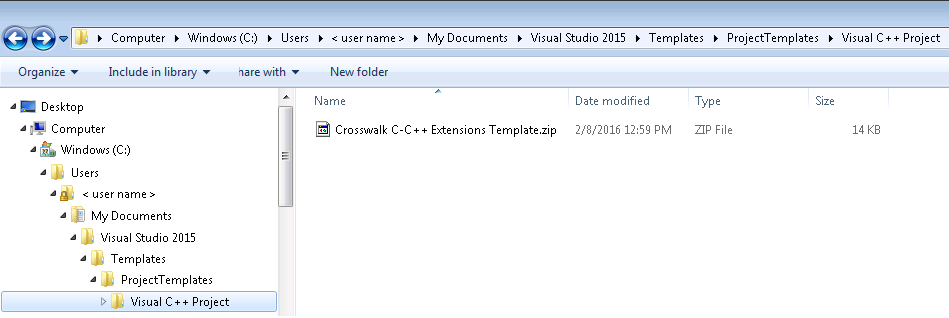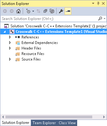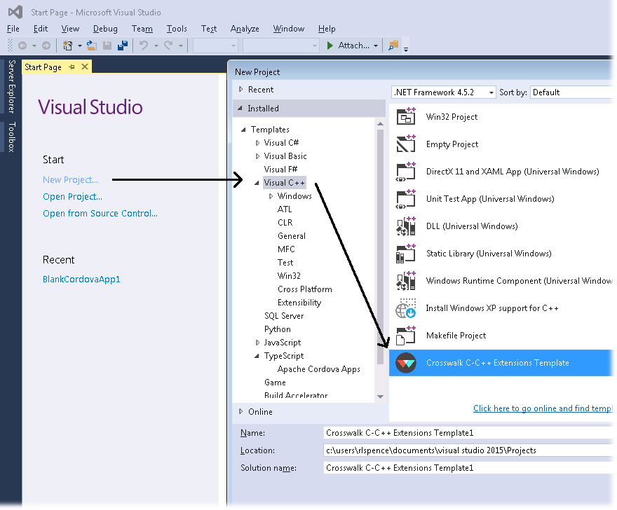 Open Visual Studio and click “New Project” then “Templates” then “Visual C++” then in the list select “Crosswalk C-C++ Extensions Template”
